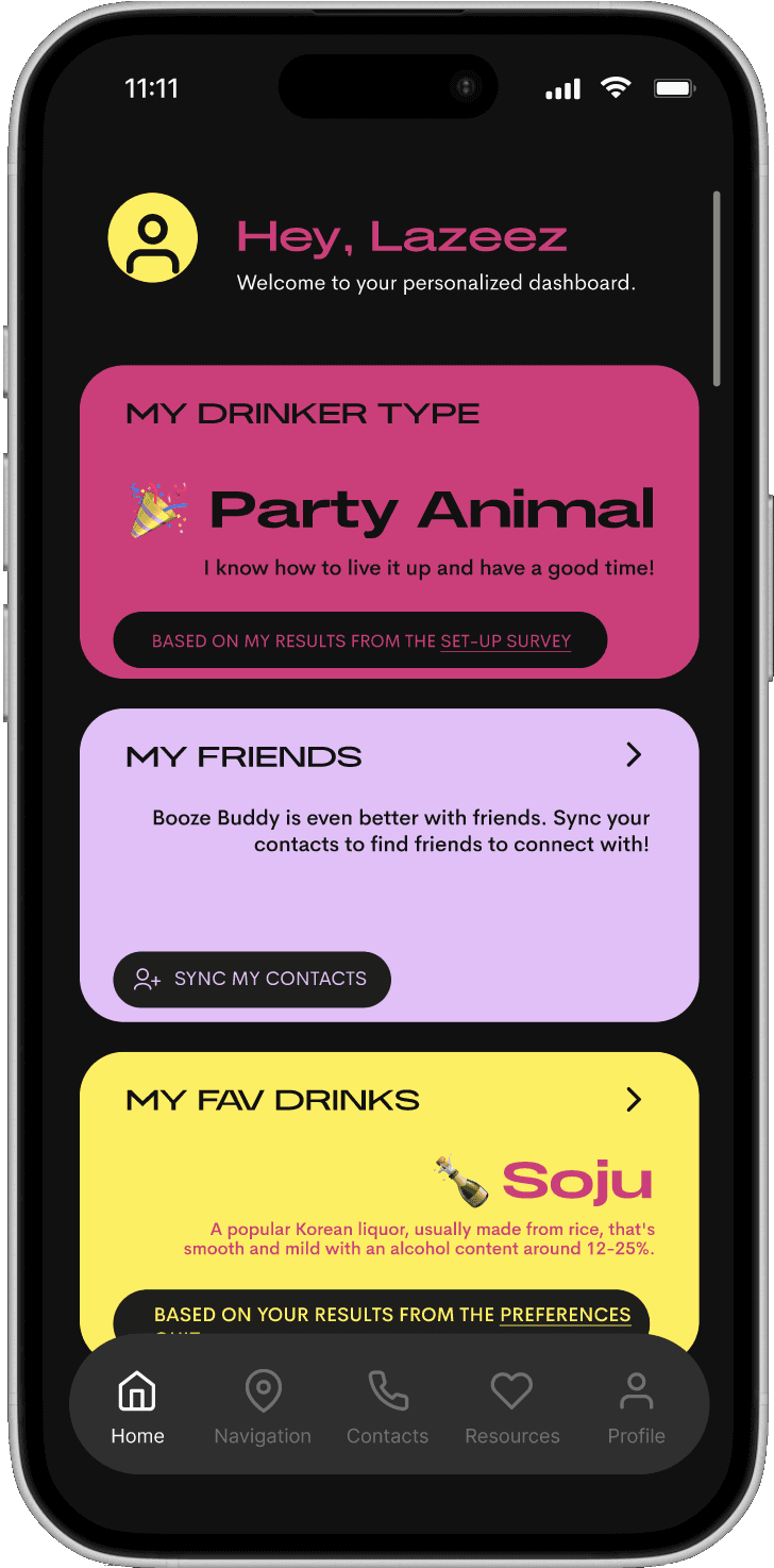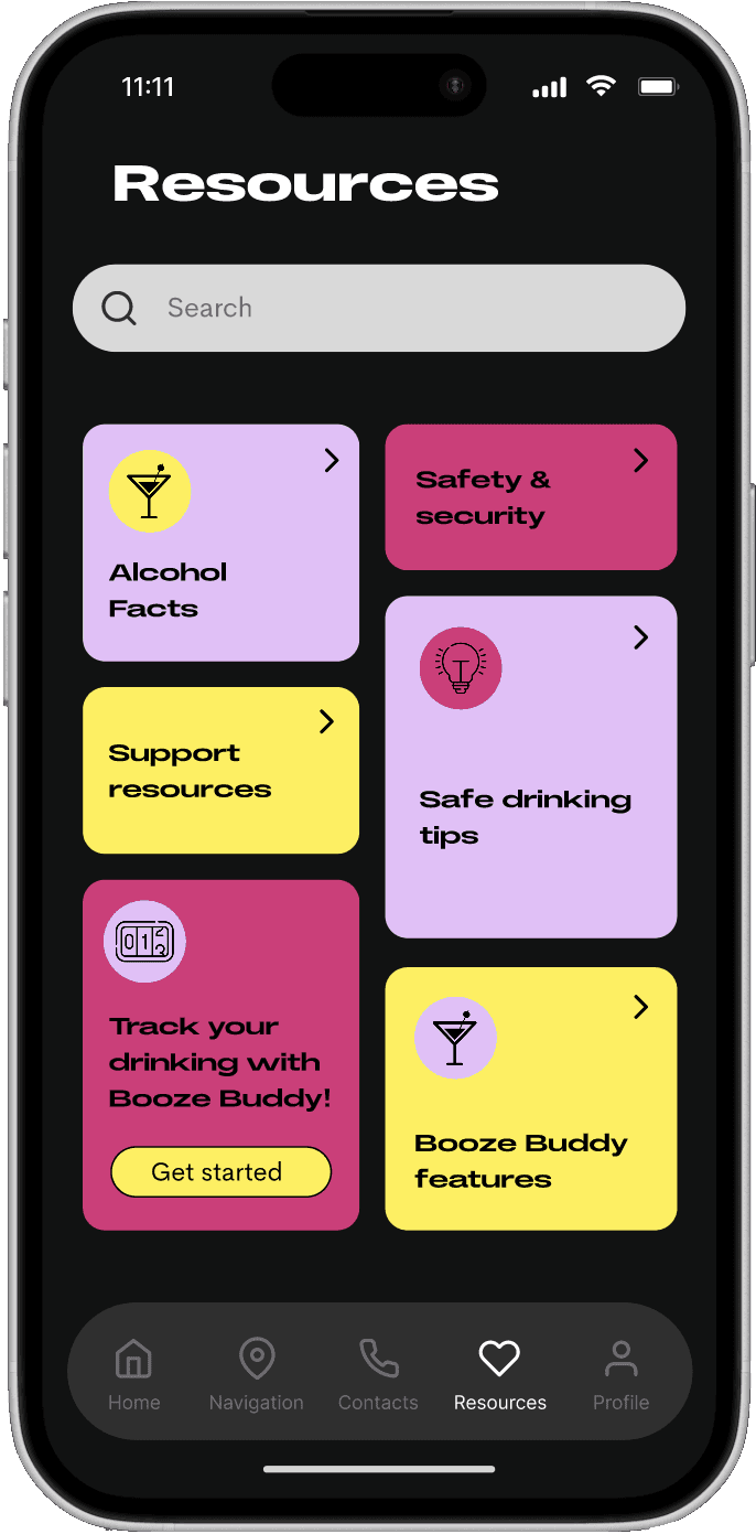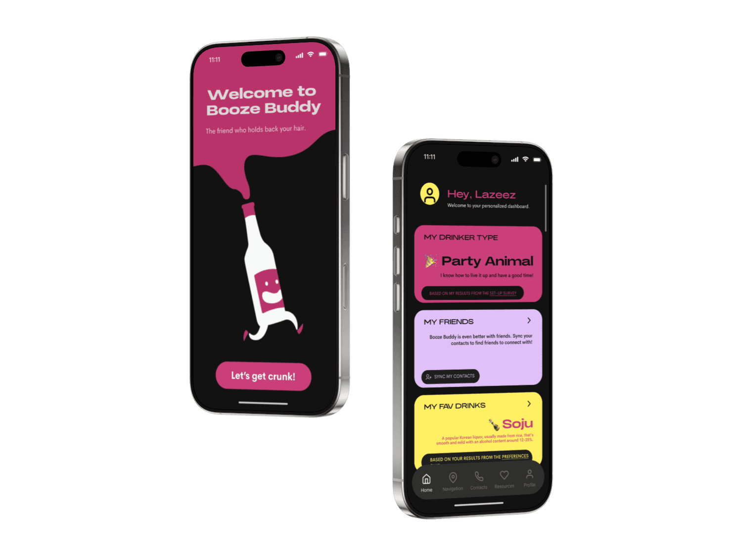 Booze Buddy is a mobile app designed to support young adults in developing safer drinking habits. Brought to life in Figma with an intuitive and engaging interface, the app addresses concerns about alcohol consumption by offering tools for education, tracking, and responsible decision-making. By blending practicality with a fun user experience, Booze Buddy encourages mindful drinking and promotes a healthier, more responsible social culture.